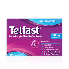 أقراص تحتوي على 180 ملغ من هيدروكلوريد فكسوفينادين الجيل الثاني، تُستخدم كمضاد للحساسية في حالات التهاب الجلد التحسسي، والتهاب الأنف التحسسي، والشرى المزمن مجهول السبب. تُؤخذ على معدة فارغة. جرعة واحدة يوميًا.