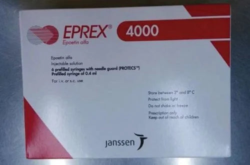 محقنة مُعبأة مسبقًا تحتوي على إريثروبويتين-ألفا ٤٠٠٠ وحدة دولية، عامل مُحفز لتكوين الكريات الحمراء (ESA)، يُستخدم لعلاج فقر الدم لدى مرضى الفشل الكلوي المزمن الذين يتلقون العلاج الكيميائي، وفقر الدم الناتج عن الزيدوفودين لدى مرضى فيروس نقص المناعة البشرية. *طريقة الإعطاء: تحت الجلد، باستثناء مرضى الفشل الكلوي المزمن الذين يخضعون لغسيل الكلى. ملاحظات: *تُحفظ القوارير سليمة في درجة حرارة تتراوح بين ٢ و٨ درجات مئوية. *لا تُجمد. *لا تُرجّ. *استخدم جرعة واحدة لكل قارورة. *لا تُعِد إدخال القارورة؛ تخلص من الأجزاء غير المستخدمة. *يُستخدَم فقط تحت إشراف طبي. *يُحفظ في الثلاجة.