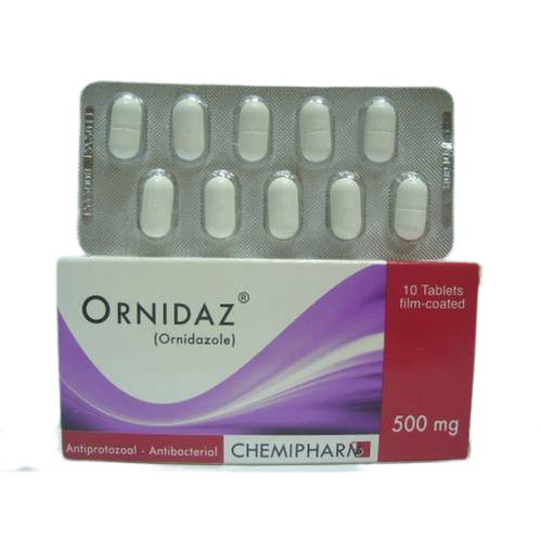 أقراص تحتوي على أورنيدازول 500 ملغ "عامل مضاد للطفيليات الأولية ومضاد للبكتيريا" والذي يستخدم لعلاج الالتهابات المختلفة في الجهاز الهضمي والمسالك البولية والمناطق التناسلية والتي تسببها البكتيريا اللاهوائية أو الأميبا الجرعة: - *الأطفال> 35 كجم والبالغين: - المشعرات: 1.5 غرام جرعة واحدة لمدة يوم واحد؛ بدلاً من ذلك، 0.5 غرام مرتين يوميًا لمدة 5 أيام. - داء الأميبات (مع الزحار الأميبي): 1.5 غرام كجرعة واحدة لمدة 3 أيام؛ يجب على المرضى> 60 كجم تناول 1 غرام مرتين يوميًا لمدة 3 أيام. - داء الجيارديات: 1.5 غرام كجرعة واحدة لمدة 1-2 يوم.