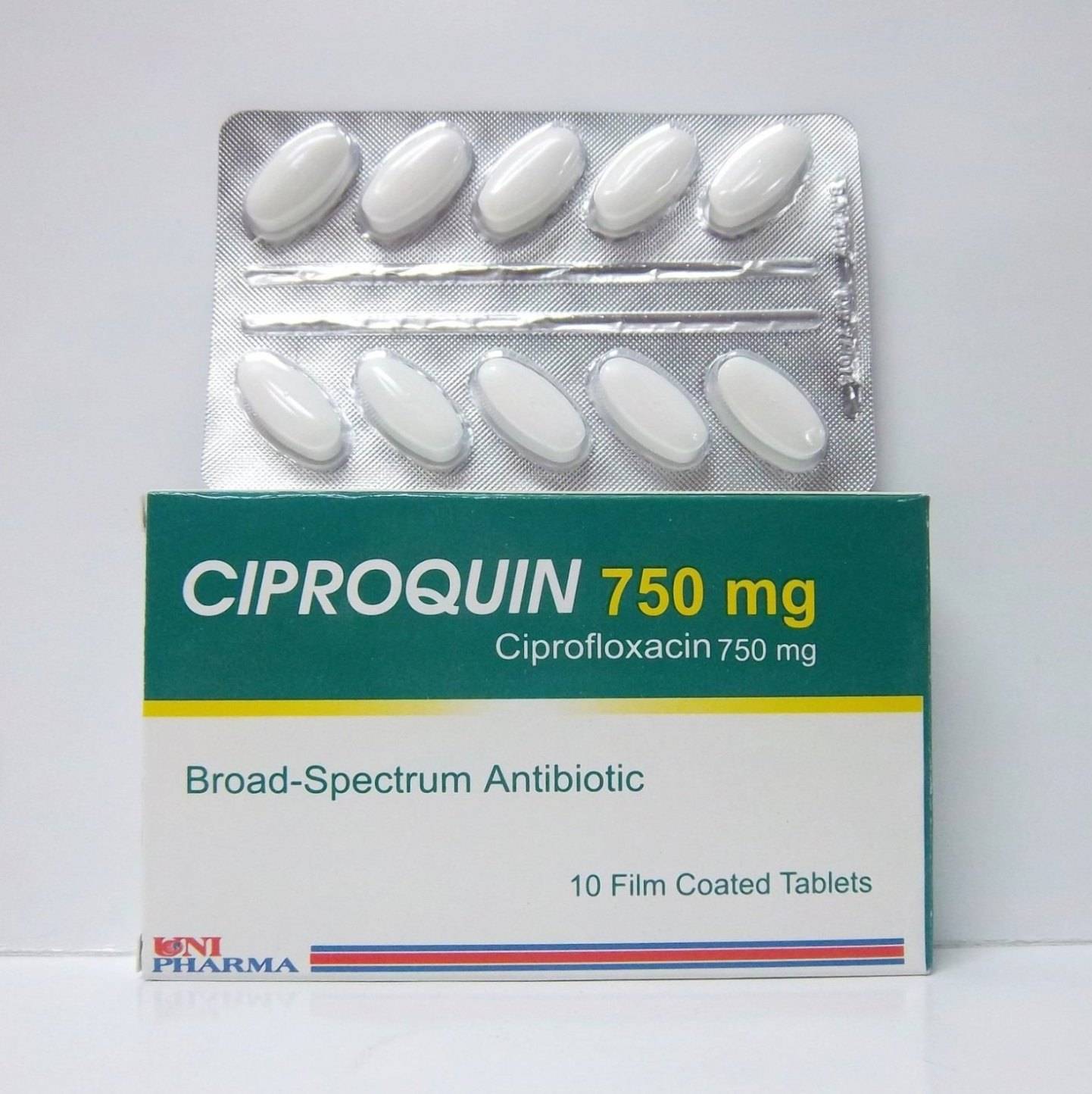 أقراص غشائية تحتوي على 750 ملغ من السيبروفلوكساسين، تُستخدم كمضاد حيوي واسع الطيف. *ملاحظة: يُعطى قبل ساعتين على الأقل أو بعد 6 ساعات من تناول مضادات الحموضة أو غيرها من المنتجات التي تحتوي على الكالسيوم أو الحديد أو الزنك.