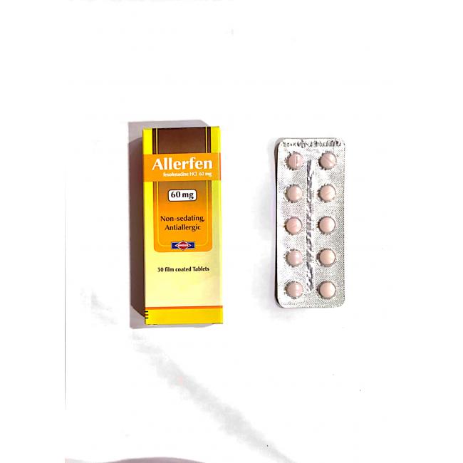 أليرفين ٦٠ ملغ ٣٠ قرصًا: مضاد للهيستامين يحتوي على فكسوفينادين. يُستخدم لتخفيف أعراض الحساسية، مثل العطس وسيلان الأنف وحكة العين والشرى. يعمل عن طريق تثبيط الهيستامين، وهو مادة كيميائية طبيعية تُسبب ردود فعل تحسسية.