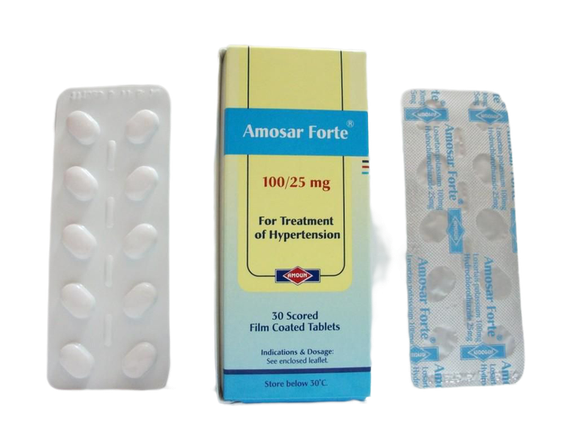 أقراص تحتوي على 100 ملغ من لوزارتان البوتاسيوم "حاصرات مستقبلات الأنجيوتنسين 2" و 25 ملغ من هيدروكلوروثيازيد "مدرات البول الثيازيدية" إدارة ارتفاع ضغط الدم وارتفاع ضغط الدم مع تضخم البطين الأيسر.