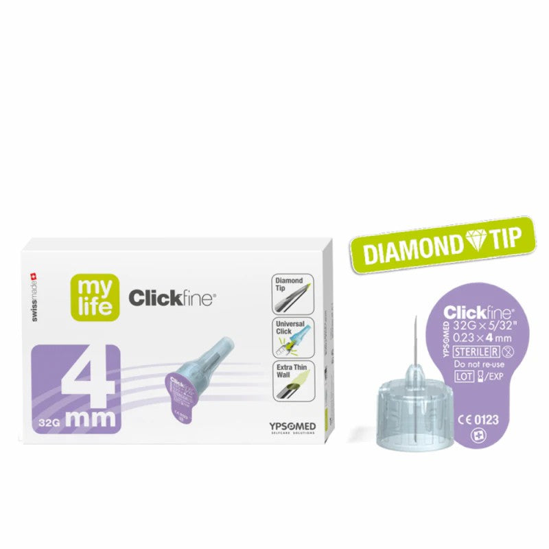 The MyLife Clickfine 32G 4mm Pen Needle is designed with convenience and injection comfort in mind. The anti-coring design prevents fraying of the surrounding tissue and the diamond design promotes smooth penetration. The patented universal click technology promotes easy attachment to most insulin pens. 6-bevel needle tip for a smoother injection Extra Thin Wall cannula for an optimised drug flow Click technology for an easy and secure fit Special silicone surface treatment for advanced injection comfort and smoothness Compatible with all major injection pen brands