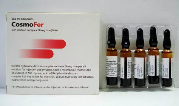 Ampoules Contain Iron Elemental 50 mg As Iron Supplement In Anemia Case Of Iron Deficiency Due To Malabsorption & Chronic Blood Loss Cases. * A Test Dose Should Be Administered On The First Day Of Therapy; Administer Slowly Over At Least 30 Seconds & Observe For At Least 1 Hour For Hypersensitivity Reaction, Then Administer The Remainder Of The Day's Therapeutic Dose. * Avoid Dilutions With Dextrose Increased Incidence Of Local Pain & Phlebitis. *Diluted In Normal Saline.