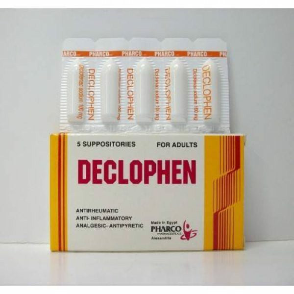 Suppositories Contain Diclofenac Sodium 100 mg " Nonsteroidal Anti-inflammatory Drug (NSAID) " Used As Analgesic In Case Of Ankylosing Spondylitis , Primary Dysmenorrhea , Migraine Attacks With Or Without Aura In Adults , Osteoarthritis , Rheumatoid Arthritis, Management Of Mild To Severe Pain. Contraindications: Severe Uncontrolled Heart Failure , Active GI Bleed Or Perforation , Ulcerative Colitis , Any Other Bleeding Disorders , Severe Hepatic Impairment & Severe Renal Impairment. Keep In The Fridge.