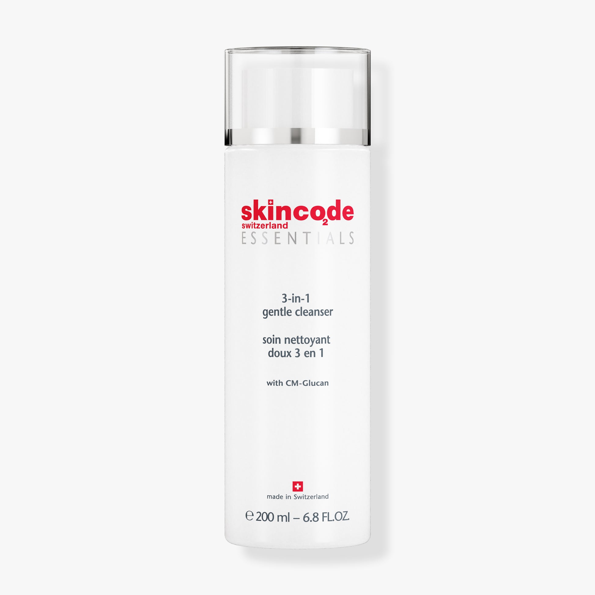 SKINCODE ESSENTIALS 3-IN-1 GENTLE CLEANSER In one simple step this gentle lotion cleanses, removes eye make-up and nourishes the skin. The 3-in-1 Gentle Cleanser is formulated with the healing, soothing and regenerating properties of CM-Glucan, in addition to nourishing Apricot Oil and moisturizing Pro-Vitamin B5. Its light, milky formula is ideal for all skin types and respects the skin’s natural moisture balance.