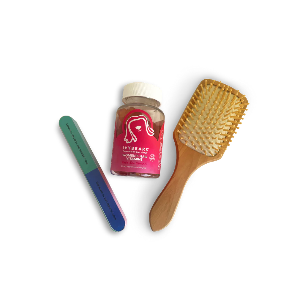IVYBEARS HAIR VITAMINS F/W 60GUM+BRUSH+NAIL FILE: This is a product that contains a hair care kit for women that includes gummy vitamins, a hair brush, and a nail file. The gummy vitamins provide biotin, folic acid, zinc, and vitamins A, C, D3, E, B5, B6, B12 to support hair growth, strength, and shine. The hair brush helps detangle and smooth the hair without causing damage or breakage. The nail file helps shape and polish the nails without splitting or peeling. The kit is designed to improve the appearance and health of the hair and nails.