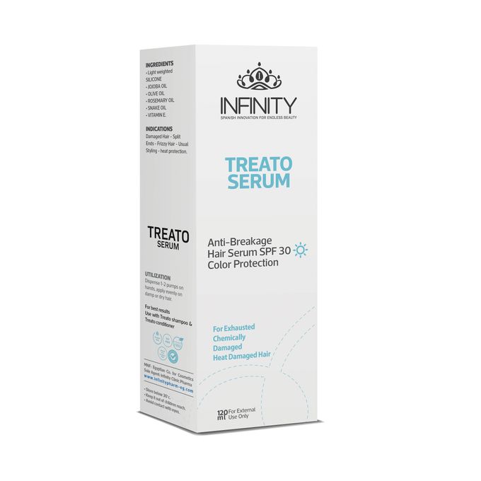 An offer package from Infiniti contains: Two bottles of Infiniti SPF 30 Treato Serum 120 ml: A light-textured serum composed of a group of oils, containing a sun protection factor SPF 30 that makes it suitable for use before exposure to the sun and heat. Soothes hair and reduces damage.