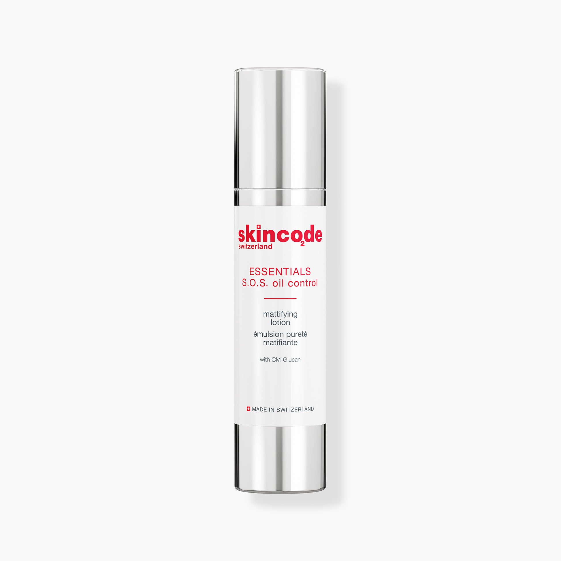 SKINCODE ESSENTIALS S.O.S. OIL CONTROL MATTIFYING LOTION The Mattifying Lotion is a very light and hardworking daily moisturizer that helps regulate oil production and reduces breakouts to promote a clear and healthy skin with a matte, shine-free finish. It is formulated with the healing, soothing and regenerating properties of CM-Glucan, in addition to a Pore Refining Active, oil production regulating Nettle Extract and antioxidant rich Vitamin C + E. Its lightweight, gel texture is ideal to promote a calmer, shine-free complexion for break-out prone, oily and combination skin types.