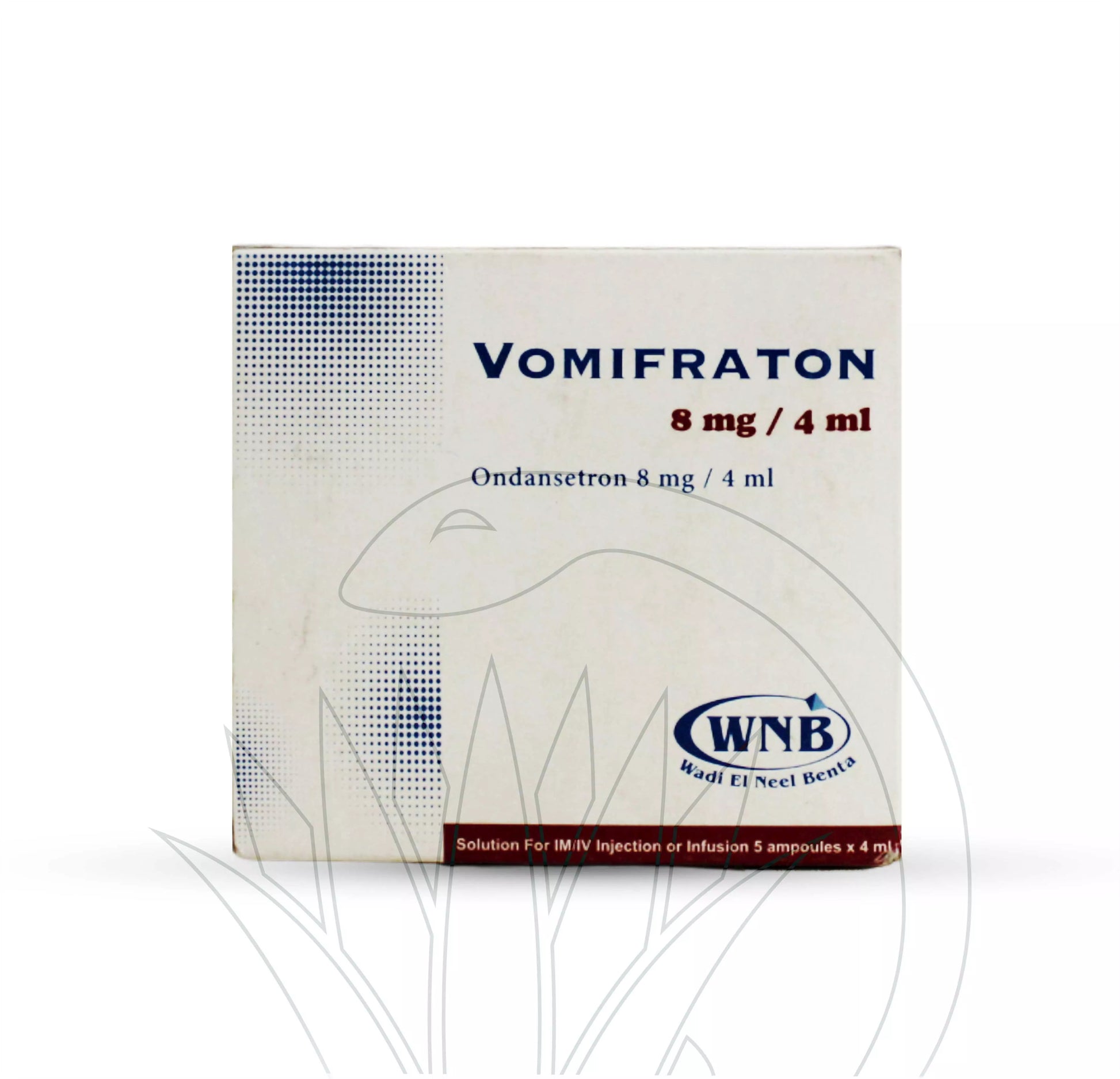 VOMIFRATON 8MG/4ML 5AMP: This is an antiemetic, used to prevent or treat nausea and vomiting caused by chemotherapy, radiotherapy, or surgery. It contains ondansetron, which blocks the action of serotonin, a chemical that triggers nausea and vomiting9. The usual dose is 8 mg given as an intravenous or intramuscular injection before treatment or surgery, and another 8 mg given orally 12 hours later10.
